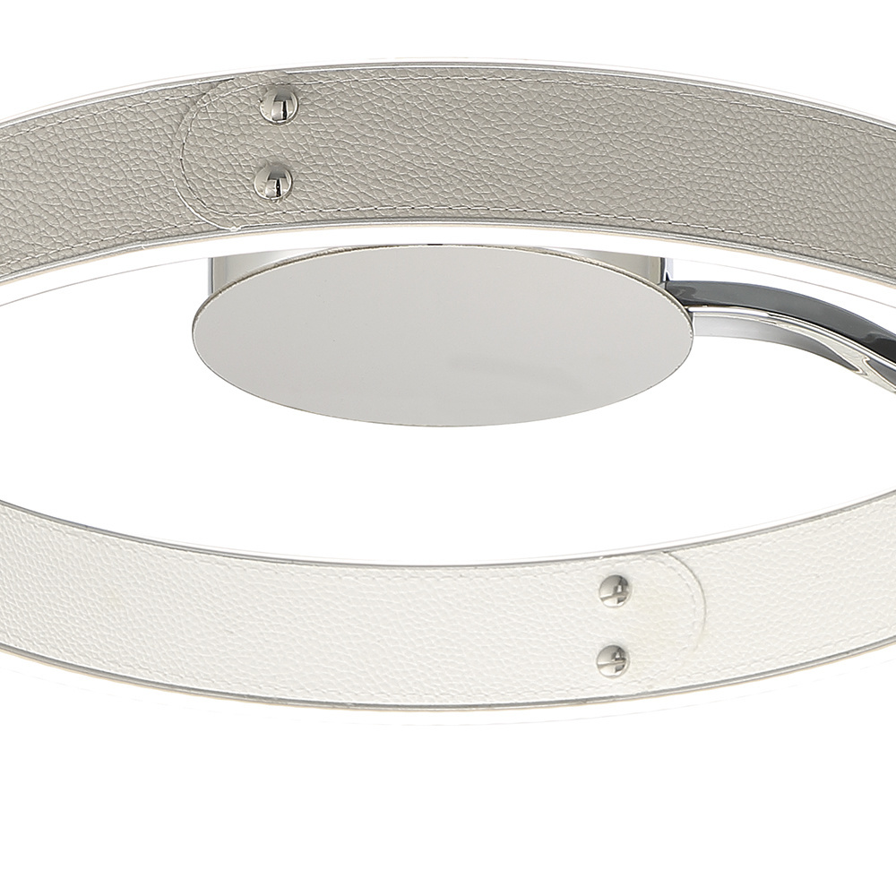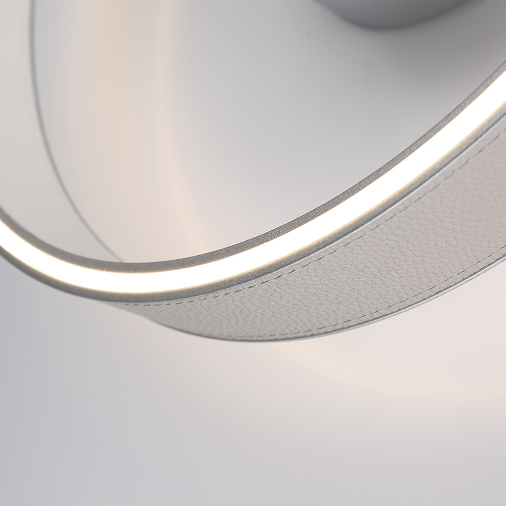 The Verdura collection features vegan leather, accentuated by decorative silver studs. The two-toned fabric highlights one color on the inside while displaying a complementary second color on the outer ring. The textured grooves are highlighted by the luminous glow of integrated LED lights that are encased between. This collection is not only abundant in size but also in the number of fixtures offered. Be it a small home office or a grand staircase, the Verdura collection is available in a range of fixture sizes to fit any room space.