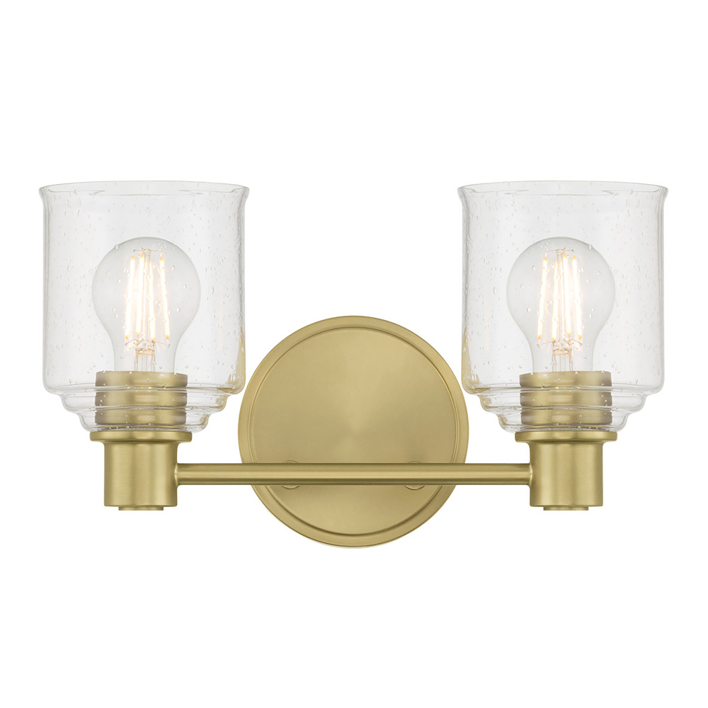 Featuring a Vintage Brass finish with a Clear Seeded glass shade.