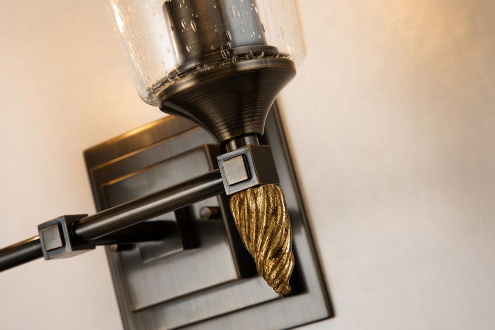A 1950s-inspired Vetiver sconce in dark bronze with a gold finial and seeded glass. Its double square backplate adds vintage charm to bedrooms, dining, nooks, or bathrooms, blending style and function with a warm glow.