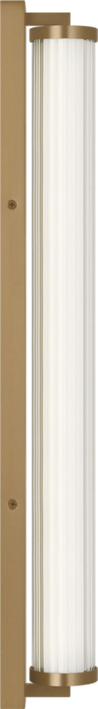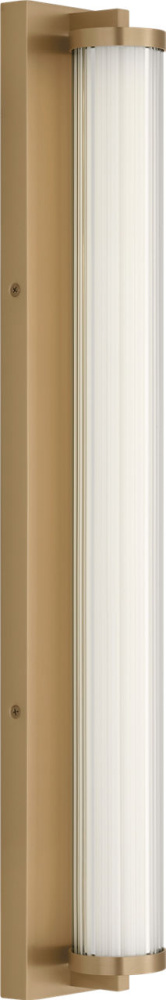 The Weston 28" Vanity combines linear symmetry with material depth, featuring a ribbed glass lens framed by a full-length metal backplate. Dedicated LED technology delivers efficient, ambient light while the textured diffuser enhances clarity and softens glare. suited for horizontal mounting in bathrooms and powder rooms where diffused illumination and visual structure are required.