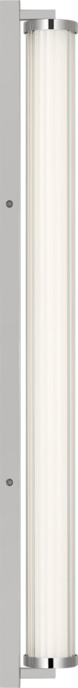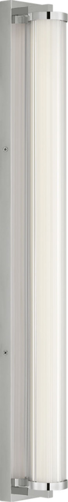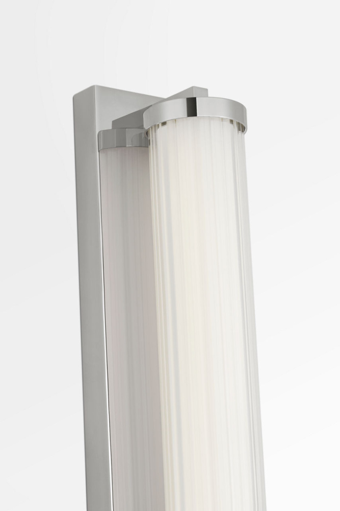 The Weston 34" Vanity combines linear symmetry with material depth, featuring a ribbed glass lens framed by a full-length metal backplate. Dedicated LED technology delivers efficient, ambient light while the textured diffuser enhances clarity and softens glare. suited for horizontal mounting in bathrooms and powder rooms where diffused illumination and visual structure are required.