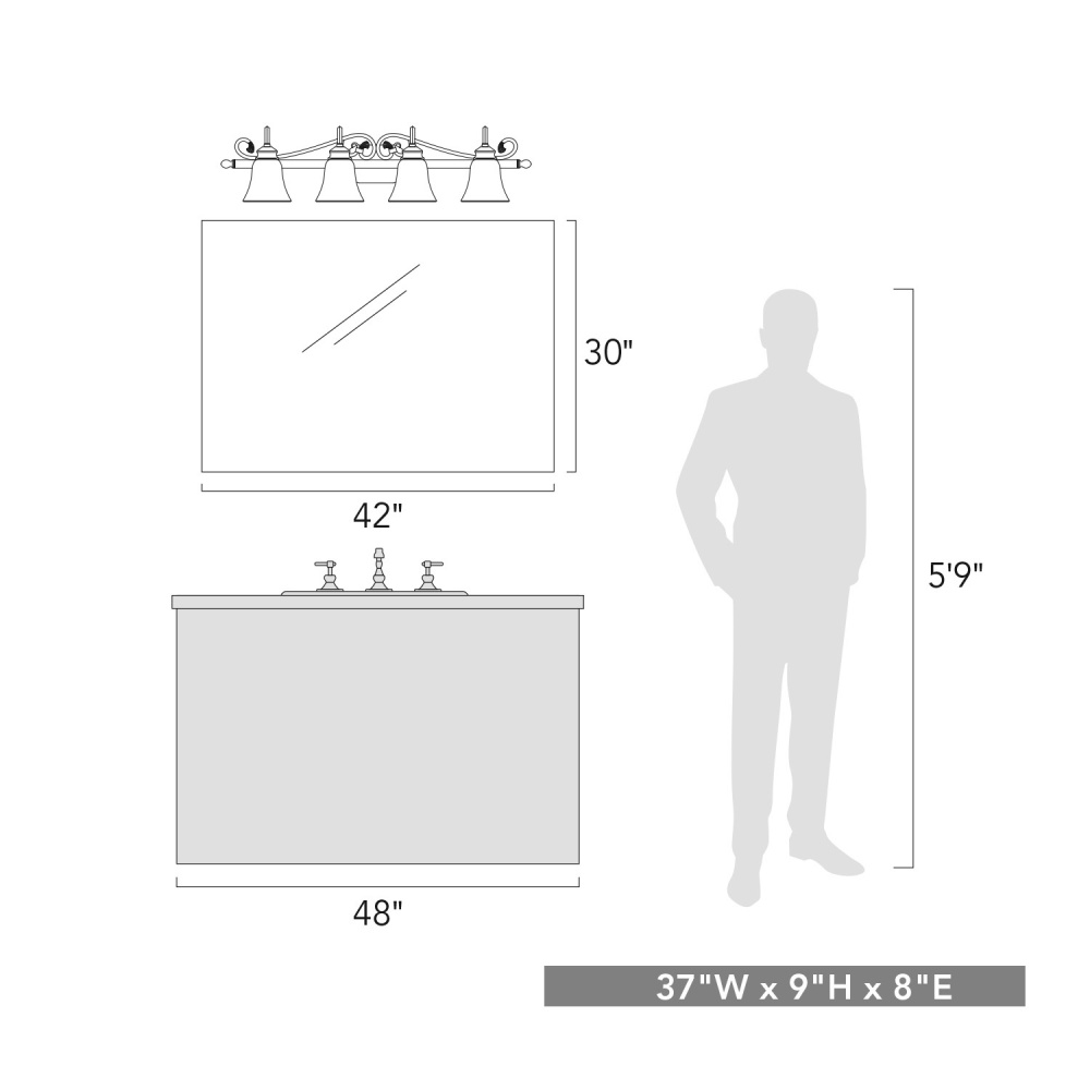 Bring traditional elegance into your home with the Wry Lighting Belle Meade 4-light Vanity. Featuring an etched amber glass shade and a Rubbed Bronze frame, it creates a welcoming atmosphere. The etched amber glass shade offers a smooth, frosted texture that provides a warm, diffused light, enhancing the rustic character of any space. With its meticulously brushed Rubbed Bronze finish, this fixture adds depth and sophistication, complementing a wide range of styles from traditional to transitional. Brighten up bathrooms with dedicated lighting that flatters while providing practical task illumination. The fixture is Damp Location Rated, making it suitable for covered and semi-enclosed spaces with occasional moisture, such as bathrooms and laundry rooms. It requires four E26 Medium base bulbs (not included), with a maximum wattage of 100 per bulb. Overall dimensions are 37"W x 9"H x 8"D. Experience the luxury of expertly crafted lighting that enhances your home's ambiance.