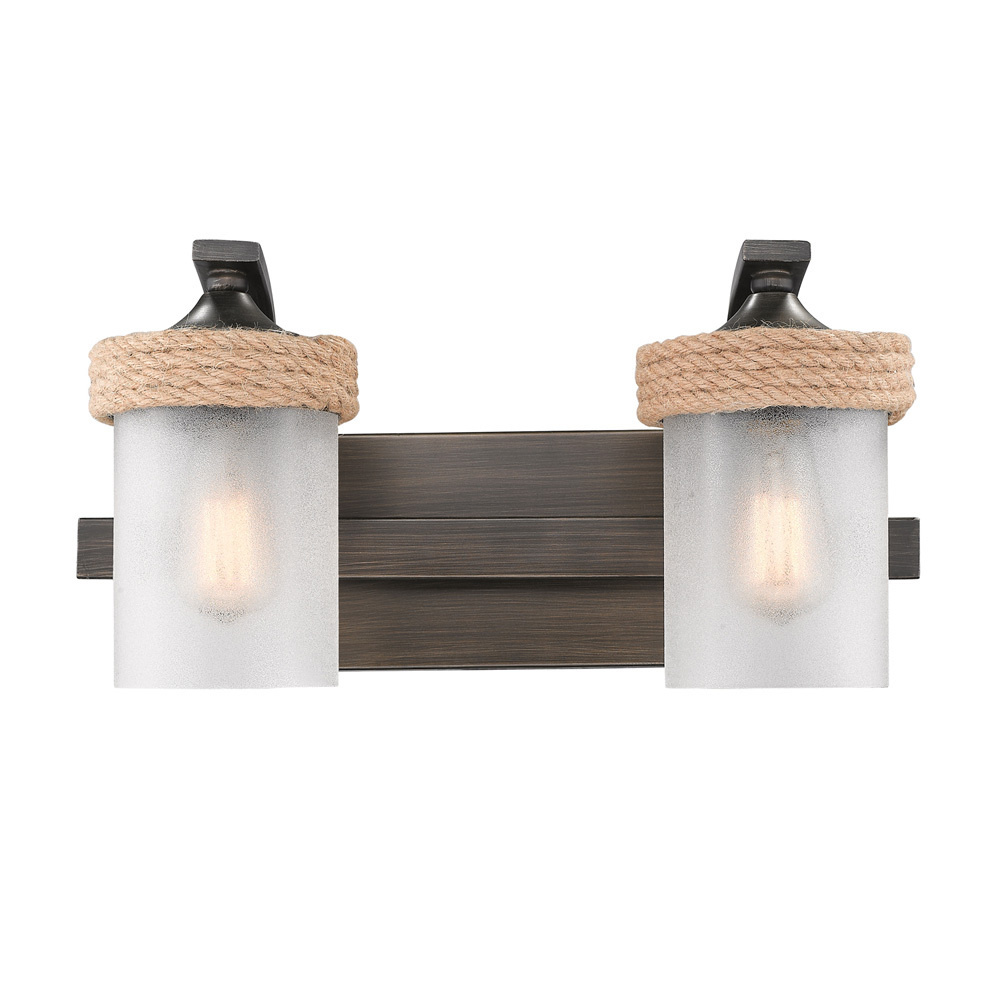 Bring coastal elegance into your home with the Wry Lighting Chatham 2-light Vanity in Gunmetal Bronze. Featuring a glass shade and a Gunmetal Bronze frame, it creates a welcoming atmosphere.\n\nThe clear sandblasted glass shade offers beautifully soft and diffused illumination, transforming harsh light into a gentle, spa-like glow with its fine, grainy texture.\n\nThe Gunmetal Bronze finish masterfully blends the warmth of bronze with industrial gray overtones, creating a chic and substantial finish that adds rustic character to any space.\n\nThis vanity light is perfect for bathrooms, damp-rated for covered spaces with occasional moisture. Use it for practical task illumination while enjoying its textural design.\n\nOverall dimensions are 16"W x 7.75"H x 7.88"D, and it requires 2 E26 Medium base bulbs (not included) with a maximum wattage of 100 per bulb.\n\nElevate your decor with the quality and style of the Wry Lighting Chatham collection, perfect for beach-inspired interiors.
