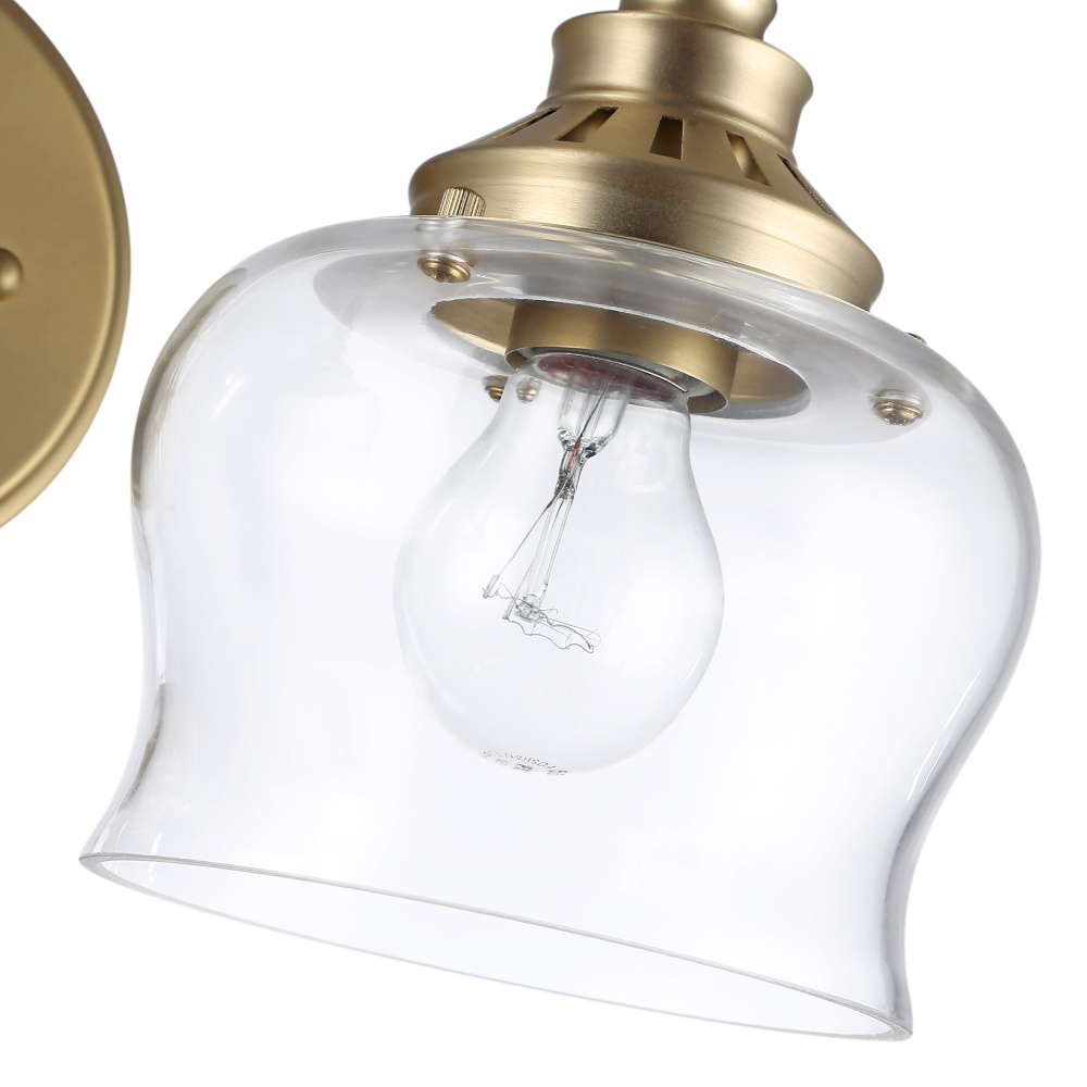 Bring Transitional elegance into your home with the Wry Lighting Daphne 2-light Vanity in Brushed Champagne Brass. Featuring a glass shade and a Brushed Champagne Brass frame, it creates a welcoming atmosphere. The clear glass shade offers brilliant, unobstructed light, making it perfect for enhancing various styles from modern farmhouse to contemporary. The finish exudes quiet luxury and adds contemporary style to any interior. Damp location rated, this fixture is suitable for covered and semi-enclosed spaces with occasional moisture, such as bathrooms and laundry rooms. Requires two E26 medium base bulbs (not included) with a maximum wattage of 60 per bulb. Overall dimensions are 15.13"W x 10.13"H x 8.5"D. Experience a blend of style and quality with this elegant piece from Wry Lighting.