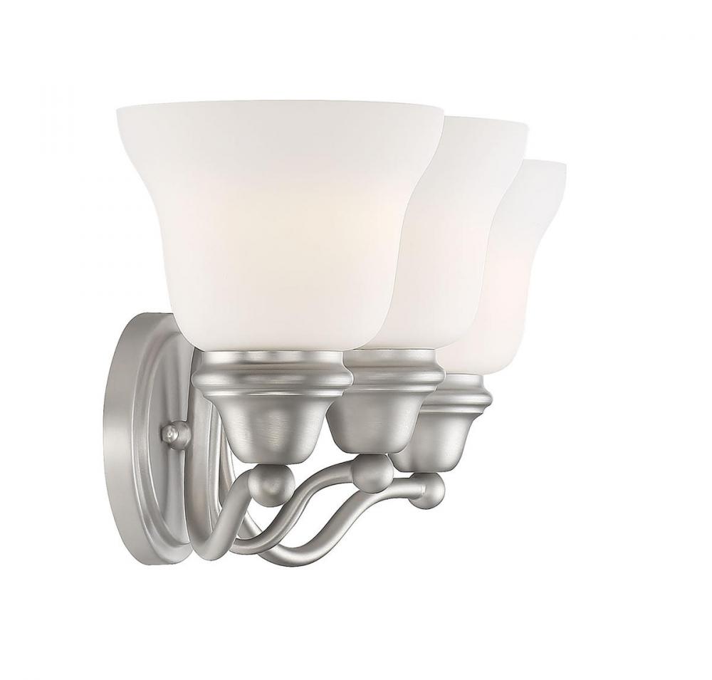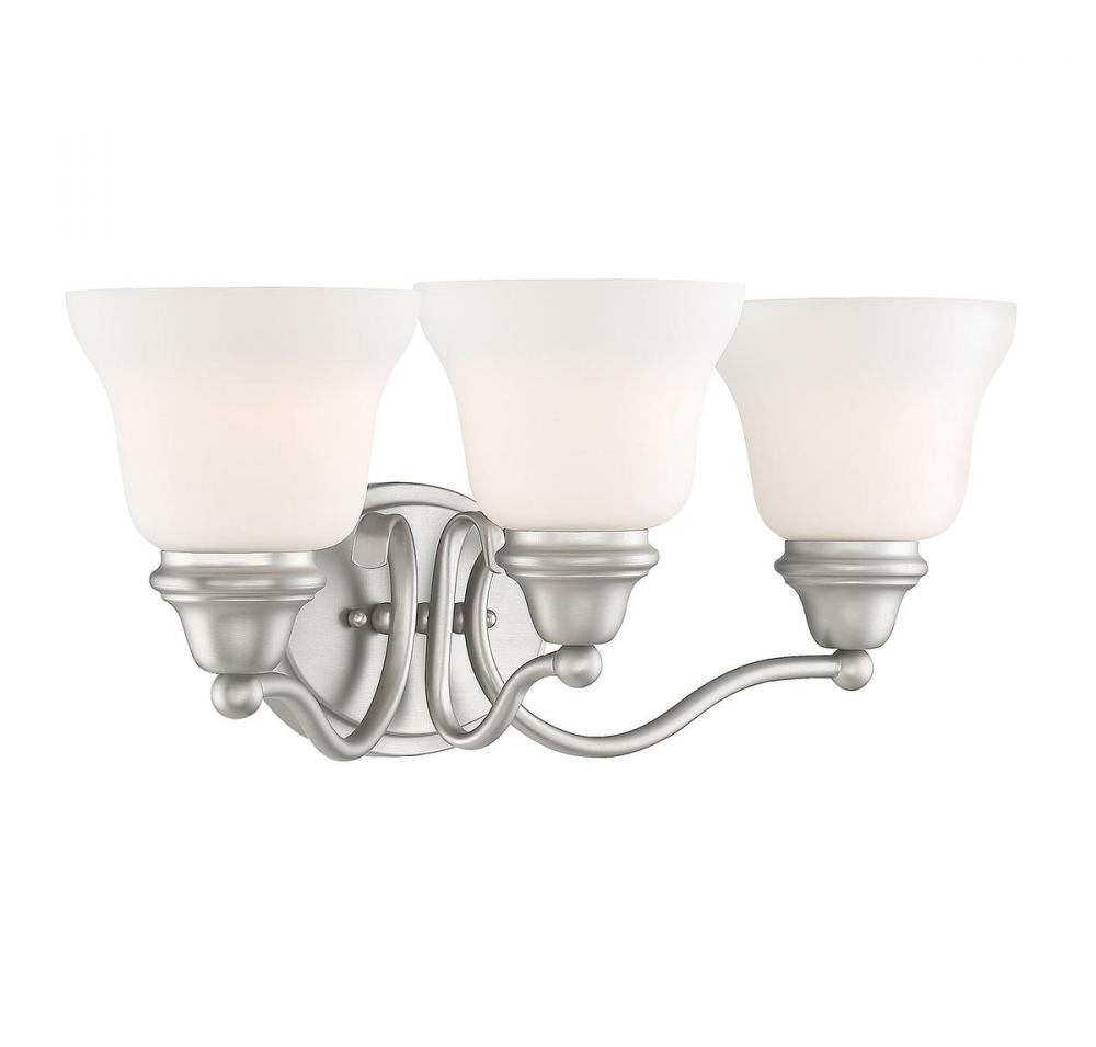 The Savoy House Yates has classic traditional style for flattering light in the bath. The style is elegant and familiar, making it a perfect choice above the vanity. The oval wall plate supports three graceful curved arms with bell-shaped shades of white glass and decorative finials finished in pewter. Each glass shade encloses a 60W standard size bulb for soft, glare-free illumination. The fixture measures 22.75" wide, 8.75" high and extends 7.5" from the wall. Plus, this bath bar may be mounted as uplight or downlight. Either way, Yates is timeless style for your bathroom or powder room.