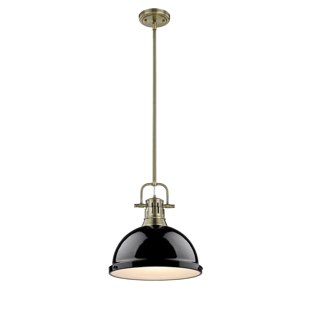 Bring farmhouse elegance into your home with the Yep by Golden Lighting Duncan 1-light 14in Rod Hung Pendant. Featuring a metal shade and an Aged Brass frame, it creates a welcoming atmosphere. This metal shade is sleek and dramatic, coated in a high-gloss black finish that beautifully reflects light and surroundings. It introduces a striking contrast and adds modern glamour to your décor. Embrace timeless elegance with our Aged Brass finish, designed to diffuse light warmly. This finish is created using a durable electroplating process, offering a tactile surface that brings character to traditional or industrial-inspired spaces. Ideal for kitchens, dining rooms, and bedrooms, this pendant is damp location rated for areas with occasional moisture, such as bathrooms and covered porches. Its sloped-ceiling compatibility and adjustable height (min: 22.875" - max: 58.875") make it a versatile choice for customized installations. Dimensions: Overall 14"W x 14.63"H x 14"D. Requires 1 E26 medium base bulb (not included, max 100 watt). Enhance your living space with timeless elegance and quality craftsmanship.