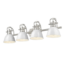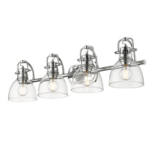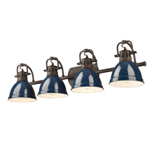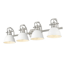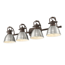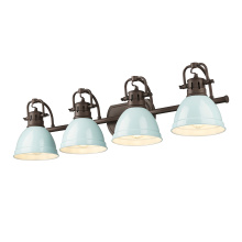 Bring traditional elegance into your home with the Yep by Golden Lighting Duncan 4-light Vanity. Featuring a metal shade and a matte black frame, it creates a welcoming atmosphere. The metal shade beautifully diffuses light, enhancing the warm, inviting ambiance of your space. The Aged Brass finish adds a sophisticated touch, featuring a low-luster satin sheen with a fine, circular brushed texture that captures and diffuses light, perfect for adding character to traditional and farmhouse interiors. Rated for damp locations, this vanity light is suitable for covered and semi-enclosed spaces like bathrooms and laundry rooms. Features adjustable directional heads for customized lighting, allowing you to highlight specific areas. Overall dimensions are 33.5"W x 8.5"H x 8.25"D, and it requires 4 E26 medium base bulbs (not included) with a maximum wattage of 100 per bulb. Experience the blend of style and function with this elegant fixture that speaks to quality and timeless design.