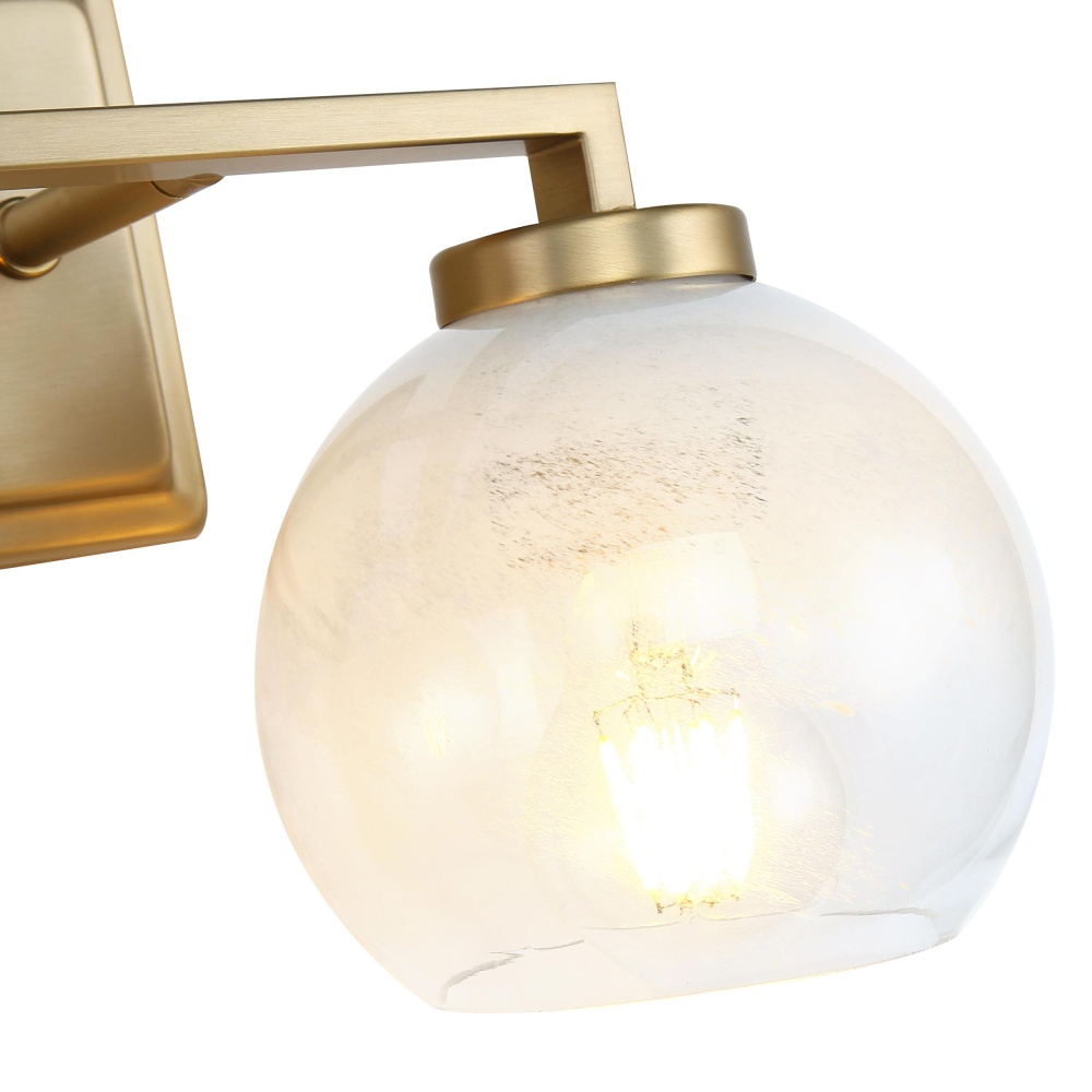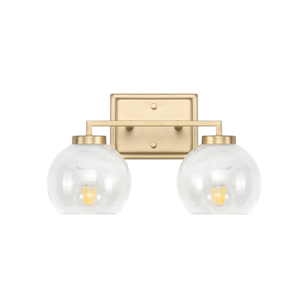 Bring Glam elegance into your home with the Yep by Golden Lighting Elliott 2-light Vanity. Featuring a glass shade and a brushed champagne brass frame, it creates a welcoming atmosphere. The clear alabaster glass shade, with its exquisite swirls, provides a soft, diffused glow that complements both classic and modern decor. The brushed champagne brass finish is an elegant alternative to traditional gold, creating a sophisticated touch wherever it is placed. Suitable for damp locations like bathrooms and laundry rooms, this fixture is both stylish and functional. Easy to install, its overall dimensions are 15.25"W x 8.75"H x 7"D, requiring 2 E26 Medium base bulbs (not included), with a maximum wattage of 60 each. Elevate your space with this stunning lighting piece.