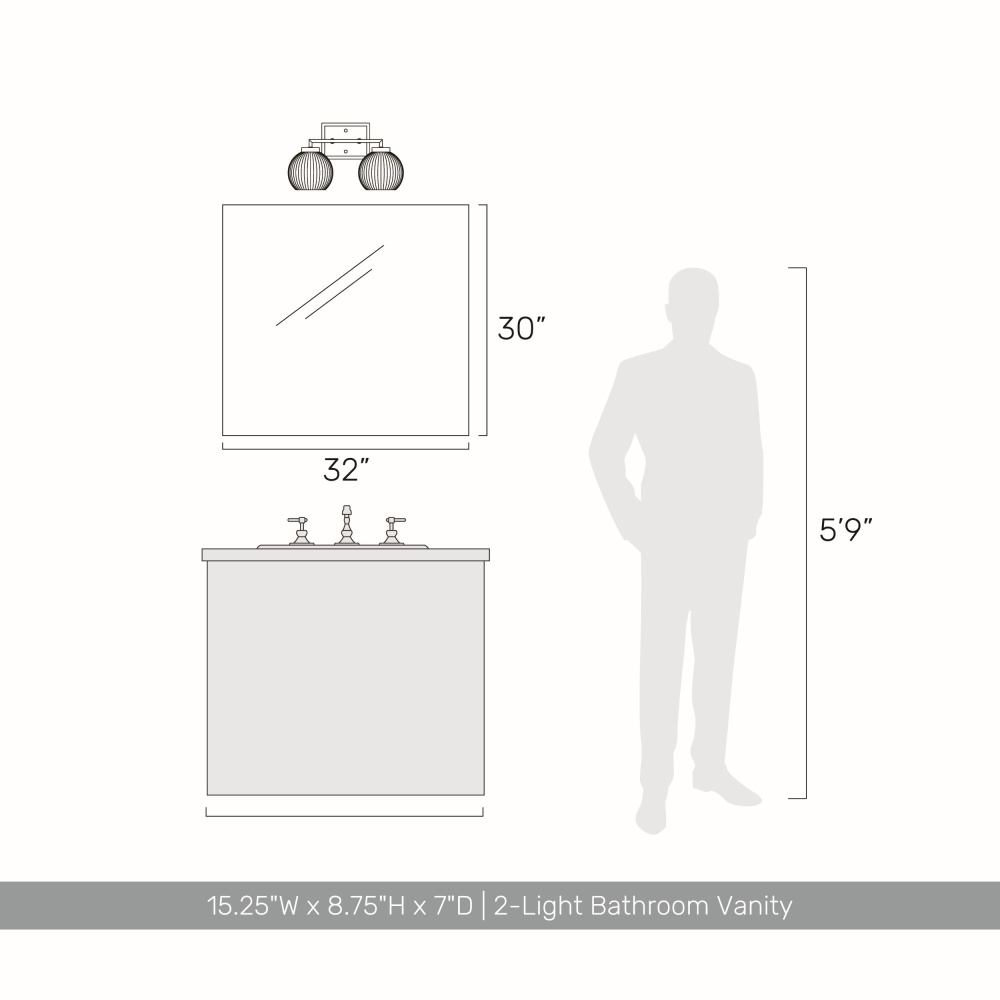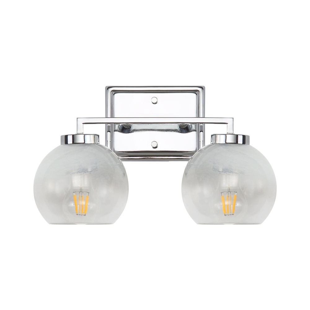 Bring Glam elegance into your home with the Yep by Golden Lighting Elliott 2-light Vanity. Featuring a glass shade and a Chrome frame, it creates a welcoming atmosphere. The Clear Alabaster Glass shade, with its unique swirl design, produces a wonderfully soft and diffused glow. Brilliant and timeless, our Polished Chrome finish offers a crisp, clean look that integrates seamlessly into any decor. This fixture is Damp Location Rated, perfect for bathrooms, covered porches, and laundry rooms. Requires 2 E26 Medium base bulbs (not included), with a max wattage of 60 per bulb. Overall dimensions are 15.25"W x 8.75"H x 7"D. Add an organic elegance and serene ambiance to your space with this stylish lighting solution.