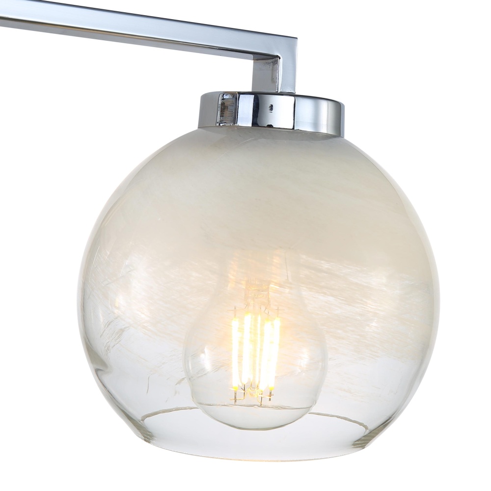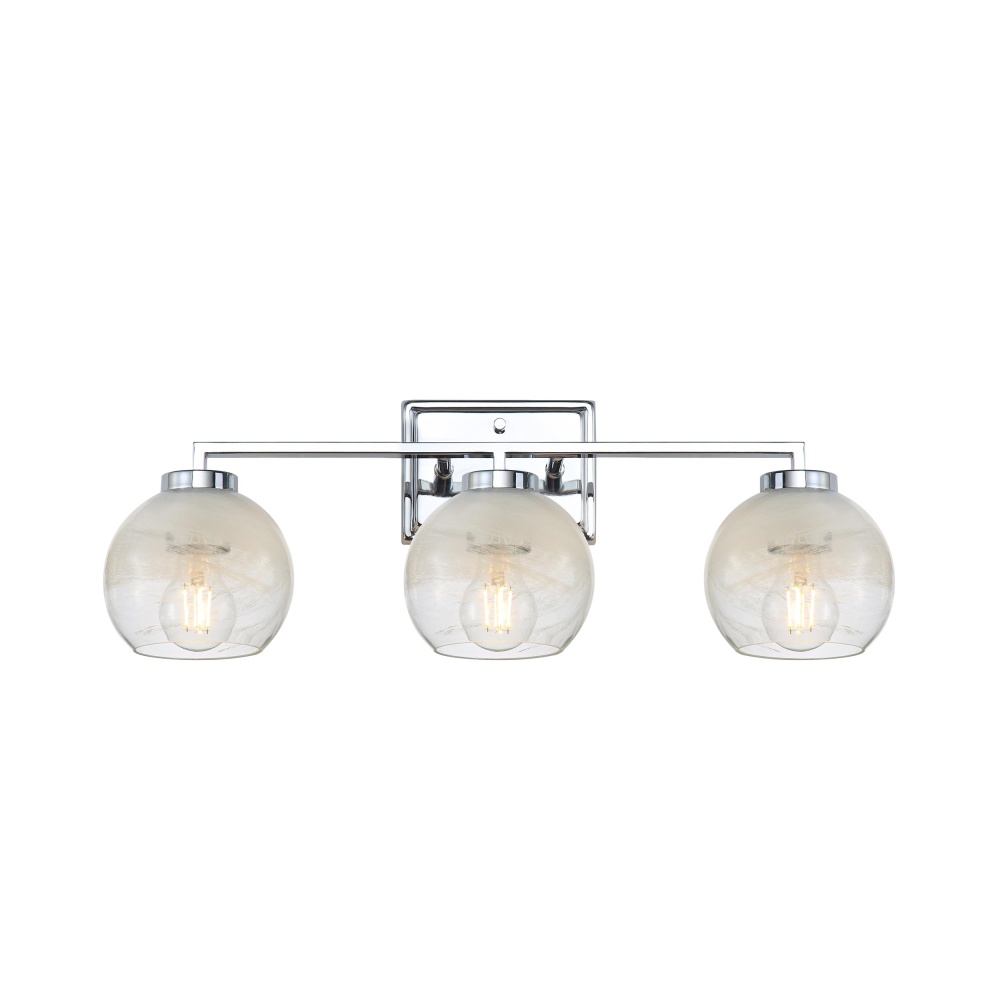 Bring Glam elegance into your home with the Yep by Golden Lighting Elliott 3-light Vanity in Chrome and Clear Alabaster Glass. Featuring a glass shade and a polished Chrome frame, it creates a welcoming atmosphere. The Clear Alabaster glass shade offers a unique spherical shape with milky-white swirls suspended in clear glass, creating a beautifully diffused glow that enhances the light's ethereal quality. The polished Chrome finish adds a crisp, clean look with a stunning high-shine gleam, effortlessly blending into various decor styles. Perfect for bathrooms, this fixture is Damp Location Rated, making it suitable for covered and semi-enclosed spaces. Requires installation with three E26 Medium base bulbs (not included) with a maximum wattage of 60 per bulb. Overall dimensions are 24.5"W x 8.75"H x 7"D, providing ideal illumination while maintaining a style that's both functional and chic. Celebrate quality and design with this elegant addition to your home.