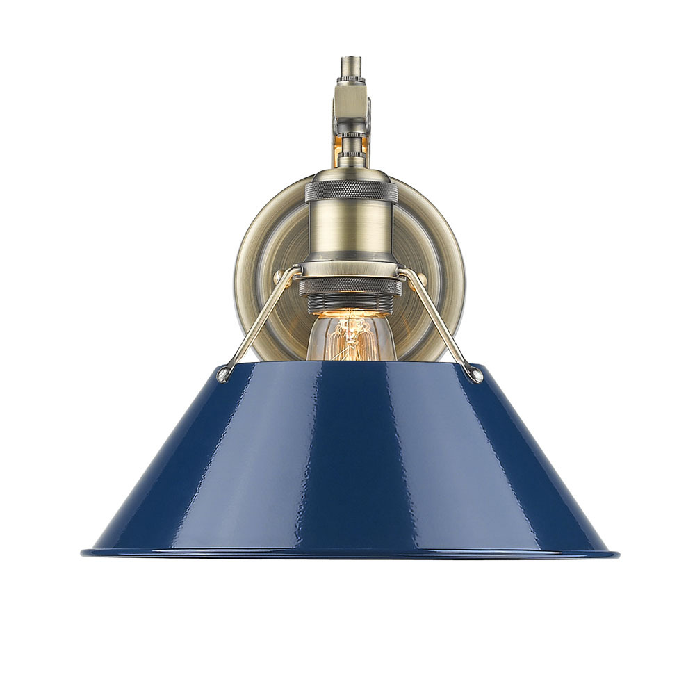 Bring industrial elegance into your home with the Yep by Golden Lighting Orwell 1-light Wall Sconce. Featuring a Metal shade and a sophisticated Aged Brass frame, it creates a welcoming atmosphere. This Metal shade features a rich, deep navy blue color with a smooth, polished enamel-like surface that reflects light beautifully, adding a touch of preppy heritage character to any space. Embrace timeless elegance with our Aged Brass finish, it offers a warm, inviting glow reminiscent of vintage heirlooms. Perfect for adding character to traditional, transitional, or industrial-inspired spaces. Suitable for covered and semi-enclosed spaces, this fixture is damp location rated, making it ideal for bathrooms and laundry rooms. Requires 1 E26 Medium base bulb (not included) with a maximum wattage of 100. Overall dimensions are 10"W x 9.63"H x 11"D, perfectly proportioned to enhance hallways, stairways, and entry points. Transform your space with this stylish lighting fixture that embodies both quality and timeless appeal.