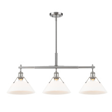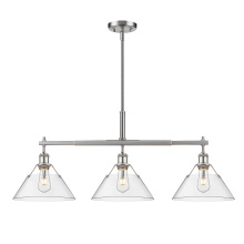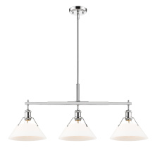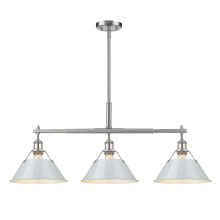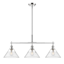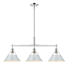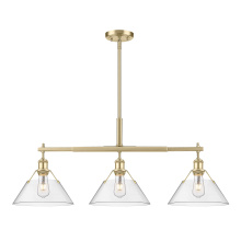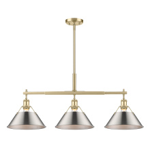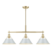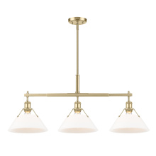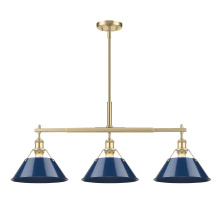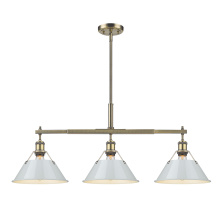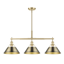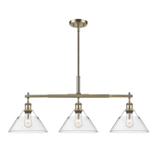 Bring industrial elegance into your home with the Yep by Golden Lighting Orwell 3-light Island Light. Featuring a metal shade and a sophisticated Aged Brass frame, it creates a welcoming atmosphere. The metal shade provides an enduring quality and allows light to disperse beautifully, bringing life to your space with its dynamic surface. Embrace timeless elegance with our Aged Brass finish that offers a warm, inviting glow, reminiscent of vintage heirlooms and classic hardware. This finish enhances your room with understated luxury and character. Tailored for kitchen islands with a Dry Location Rating, it’s ideal for indoor spaces not subject to moisture. Installation is a breeze with sloped-ceiling compatibility, and the adjustable height ranges from 17.125" to 59.125". Overall dimensions are 35.75"W x 14.5"H x 10"D, and it requires 3 E26 Medium base bulbs (not included), with a maximum wattage of 100 per bulb. Elevate your living space with a fixture that seamlessly combines functionality and style, creating an inviting atmosphere for gatherings and everyday use.