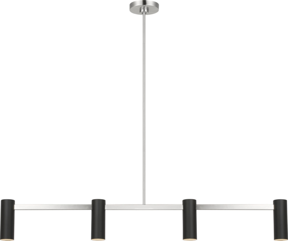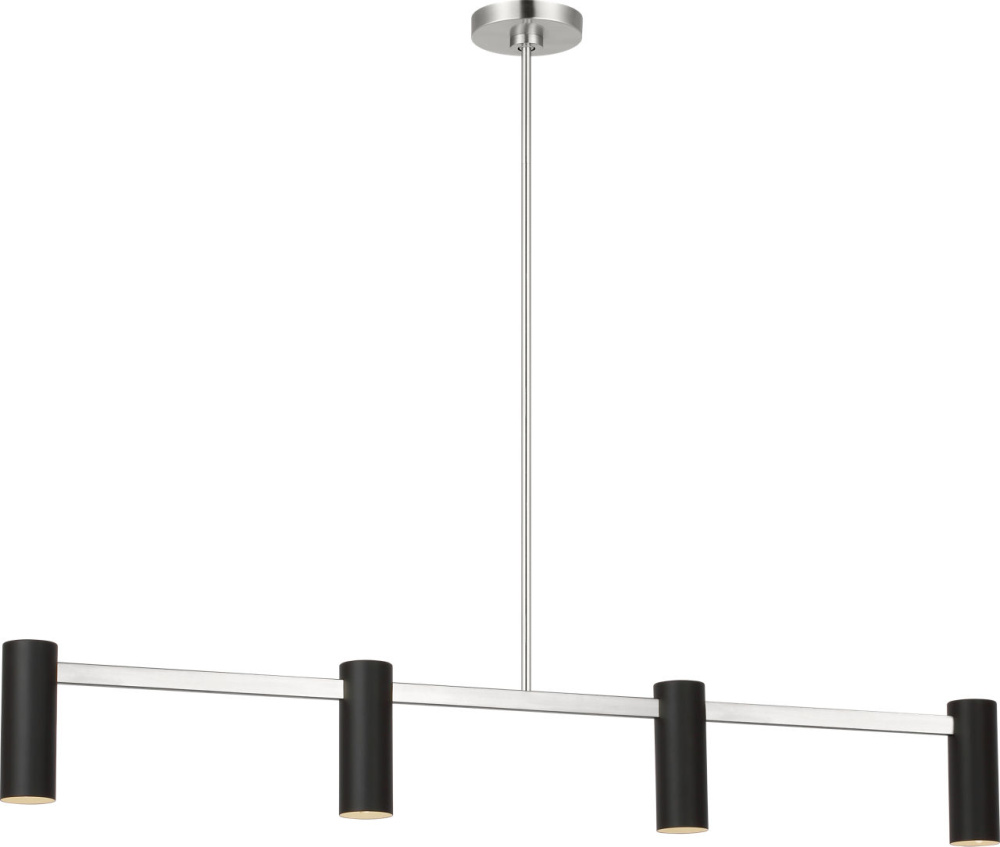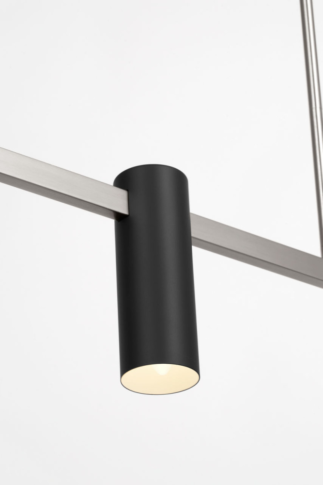 The Zentro Linear Chandelier arranges four cylindrical shades along a streamlined horizontal frame. Scaled for kitchen islands, dining tables, or workspaces, it combines strong geometry with evenly balanced light distribution.